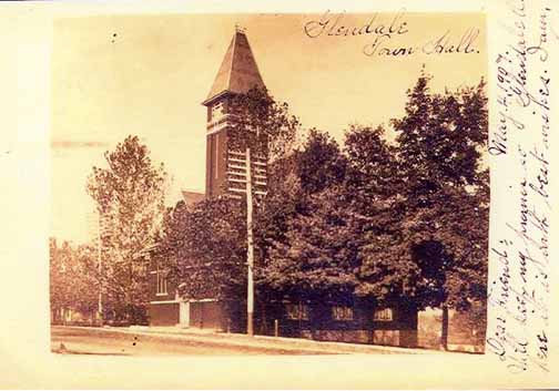 The Town Hall was probably the first major public building undertaking of the Village. Citizens voted their approval in 1869. Plans were drawn up but differences of opinion caused the project to be dropped. In 1874, the cost of labor had dropped and many citizens were in need of work, so the plans for Town Hall were resurrected. Samuel Hannaford drew up the plans and in 1875 the three story brick structure was built in a Tuscan Villa-Romanesque composite style.